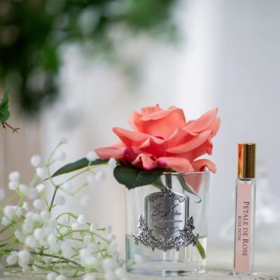 Ez a gyönyörű, élethű rózsa elegáns címerrel ellátott üvegben bármilyen belső teret egyedien díszít. Minden virágot precízen kézzel készítettek, és speciális, természetes bevonattal láttak el, amely élethű megjelenést és természetes érintést kölcsönöz a szirmoknak, mintha valódiak lennének. A rózsa mellé egy üveg keleti rózsa illatú parfüm tartozik, amelyet bármikor közvetlenül a rózsára permetezhet, hogy frissítse és fokozza az illatát. A vásárlók más illatok, akár saját parfümjük használatával meg is változtathatják virágaik illatát.