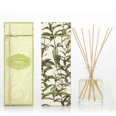 Castelbel / Portugália | Castelbel Verbena 250mL Fragrance DiffuserOlaj alapú parfüm diffúzor, amely természetes illóolajokat tartalmaz, gondosan, elegánsan illatosítva és egyéniséget adva bármely belső térnek. Nem tartalmaz alkoholt, ezért lassan párolog. Kézművesek által Portugáliában kézzel fújt, kizárólag a márka számára készült egyéni üvegben kerül forgalomba parafa dugóval együtt. Bambusz pálcák mellékelve a dobozban.