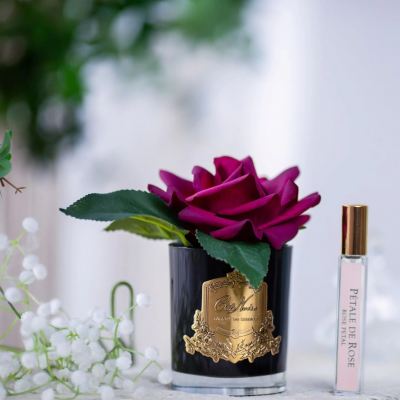 Ez a gyönyörű, élethű rózsa elegáns címerrel ellátott fekete üvegben bármilyen belső teret egyedien díszít. Minden virágot precízen kézzel készítettek, és speciális, természetes bevonattal láttak el, amely élethű megjelenést és természetes érintést kölcsönöz a szirmoknak, mintha valódiak lennének. A rózsa mellé egy üveg keleti rózsa illatú parfüm tartozik, amelyet bármikor közvetlenül a rózsára permetezhet, hogy frissítse és fokozza az illatát. A vásárlók más illatok, akár saját parfümjük használatával meg is változtathatják virágaik illatát.