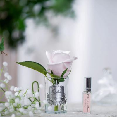 Ez a gyönyörű, élethű rózsa elegáns címerrel ellátott üvegben bármilyen belső teret egyedien díszít. Minden virágot precízen kézzel készítettek, és speciális, természetes bevonattal láttak el, amely élethű megjelenést és természetes érintést kölcsönöz a szirmoknak, mintha valódiak lennének. A rózsa mellé egy üveg keleti rózsa illatú parfüm tartozik, amelyet bármikor közvetlenül a rózsára permetezhet, hogy frissítse és fokozza az illatát. A vásárlók más illatok, akár saját parfümjük használatával meg is változtathatják virágaik illatát.