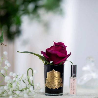 Ez a gyönyörű, élethű rózsa elegáns címerrel ellátott fekete üvegben bármilyen belső teret egyedien díszít. Minden virágot precízen kézzel készítettek, és speciális, természetes bevonattal láttak el, amely élethű megjelenést és természetes érintést kölcsönöz a szirmoknak, mintha valódiak lennének. A rózsa mellé egy üveg rózsaszirom illatú parfüm tartozik, amelyet bármikor közvetlenül a rózsára permetezhet, hogy frissítse és fokozza az illatát. A vásárlók más illatok, akár saját parfümjük használatával meg is változtathatják virágaik illatát.